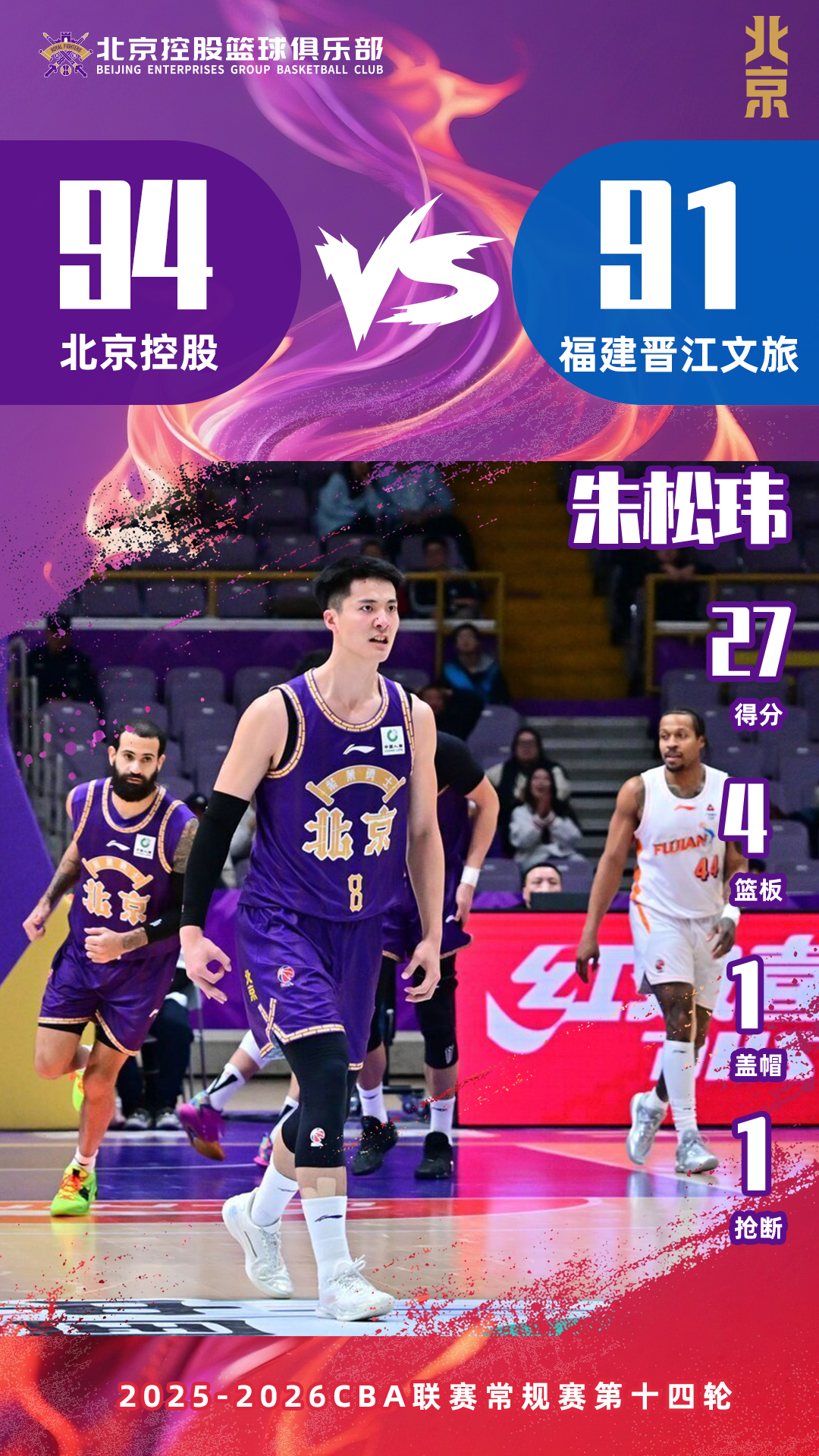 1月12日,北控男篮坐镇主场迎战福建晋江文旅。本场比赛球队开局进攻流畅防守严密,一度领先对手多达21分。下半场福建男篮进攻回暖,凭借曾凌铉连续三分命中一度追平比分。关键时刻廖三宁挺身而出,用一记三分绝杀帮助球队以94:91收获关键胜利。